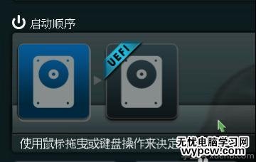 在最下方有“啟動順序”欄位,用鼠標拖動可改變啟動選項,如:我們在使用U盤PE工具安裝系統時,可將UEFI調至第一位置。