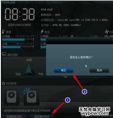 然后,用鼠標點擊“高級模式(F7)”,在彈出的頁面點擊“確定”。