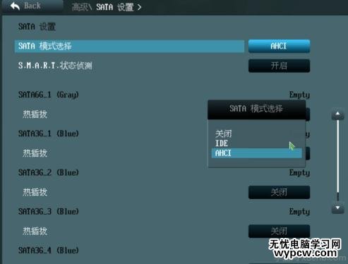在高級選項的”SATA設置“中,可更改硬盤的模式。(一般更換系統時可用到,如XP一般使用IDE模式,Win7以上系統使用AHCI模式)。