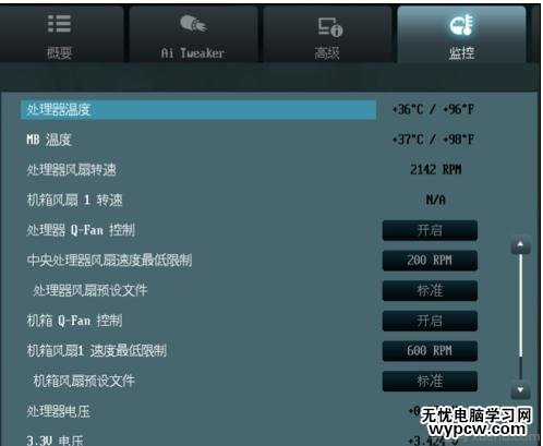 在”監控“選項中,BIOS可以時時偵測主板的溫度、風扇轉速、電腦等情況。