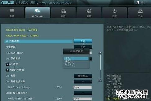 點擊“Ai Tweaker”進入超頻選項調(diào)整,使用鼠標在對應(yīng)的項目后面輸入框使用鍵鍵盤進行輸入相關(guān)參數(shù)就設(shè)置即可,一般采用默認的自動。