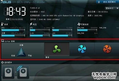EFIBIOS的默認啟動EZ Mode(簡易界面)。最上方是包括時間日期以及基本配置的系統(tǒng)信息,下來是溫度、電壓以及風(fēng)扇轉(zhuǎn)速等相關(guān)信息,中間則是三個系統(tǒng)優(yōu)化選項提供了省電、一般和華碩最優(yōu)化,最下面是獨特的啟動順序調(diào)節(jié)區(qū)。用鼠標點擊右上角語言選擇下拉菜單,可選擇對應(yīng)的語言。