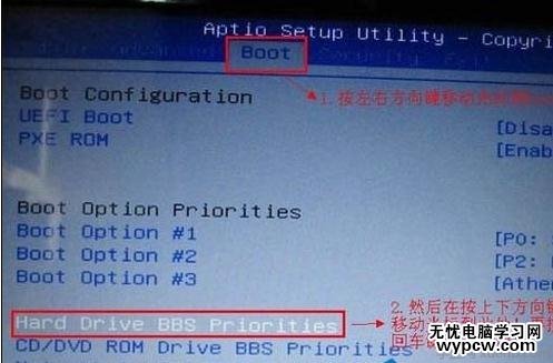 3.如上圖所示,當(dāng)我們把光標(biāo)移動(dòng)到boot后再按上下方向鍵移動(dòng)光標(biāo)到“Hard drive BBS Priorities”選項(xiàng),然后按下回車鍵。如下圖所示為按下回車鍵后顯示的界面: