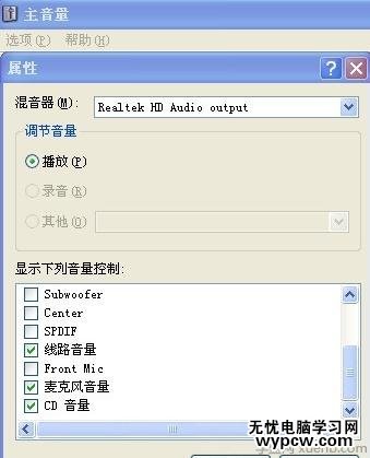 當為“靜音”時,麥克風音量下不能為靜音,線路音量和CD音量可以勾選靜音以減少噪音干擾,該類型窗口中會有一項為“錄音控制”,將滑塊調至最高并且同樣不能為靜音。