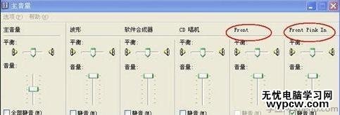 現在,在你看到窗口標題為“主音量”畫面中,Front及 Pink In的調節滑塊請拉至最頂端。而在Front Pink In底部的“靜音”是否勾選,并不影響聲卡的錄音功能。這里的靜音只是針對實時的麥克風回放,如果不勾選,你對著麥克風說話,音箱會即時回放你傳送的聲音。建議設置為靜音。注意此窗口中Front底部的靜音是不能選擇的。
