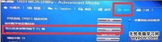 2、在bios菜單欄中點擊“啟動”,找到“若出現錯誤等待按下f1鍵”,在對應的右邊選項中選擇“關閉”,如圖:
