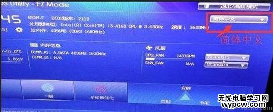 1、我們通過上圖看出,是Bios設置的問題,我們只要找到相應的設置項就能解決問題了。先按bios啟動鍵,然后我們可以選擇中文模式,在底下點擊“高級模式”,如圖: