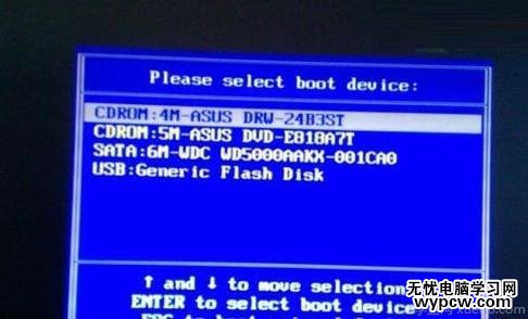 大家看下圖,將光標移動選擇到的地方顯示“USB:Gener ic Flash Disk”(小編寫這篇教程的時候使用的是u盤)所以,當我們按下快速熱鍵F8的時候顯示出來的選項中就包含有小編用u啟動制作好啟動盤的u盤。