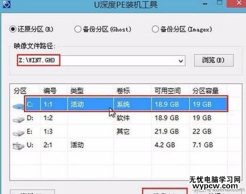 等待u深度pe裝機(jī)工具自動(dòng)加載win7系統(tǒng)鏡像包安裝文件,只需選擇安裝磁盤位置,然后點(diǎn)擊“確定”按鈕即可,如下圖所示: