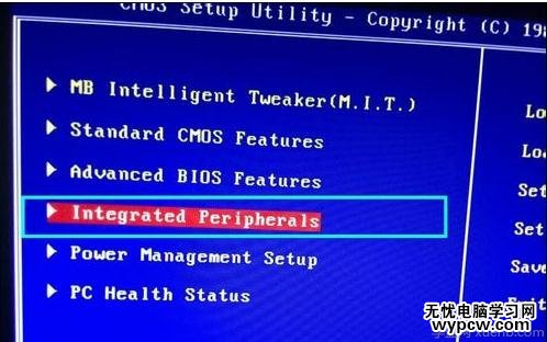 以上步驟設(shè)置好后,按“Esc”鍵 返回主板設(shè)置主菜單,選擇項目“Integrated Peripherals”