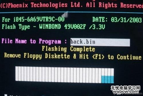 刷入加入logo的bin到主板。運行命令C:/>Awdflash back.bin /cc/cd/cp/sn/py確定后就會自動完成BIOS的刷新操作,完成后重新啟動。下圖: