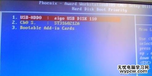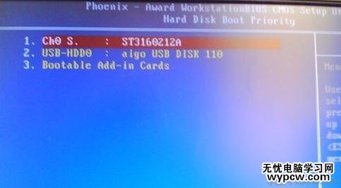 按下回車鍵后會顯示出三個選項,我們找到并按上下方向鍵選擇到“USB-HDD”(部分機型會顯示:“Hard Disk Boot Priority”那么就將其選擇到第一即可),然后按“+”號鍵將該選項移動到第一位,再按回車鍵即可。