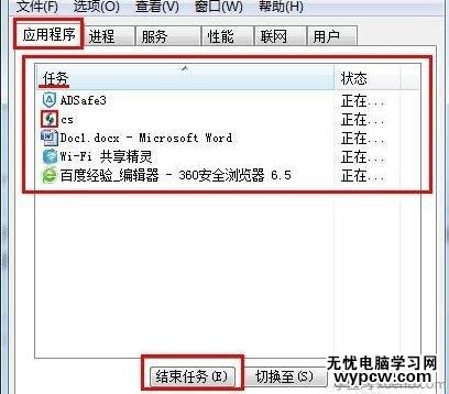 在任務(wù)管理器窗口下,“應(yīng)用程序”欄,選擇你要結(jié)束的任務(wù)(選的是讓你的電腦死機(jī)的任務(wù)),然后點(diǎn)擊“結(jié)束任務(wù)”。