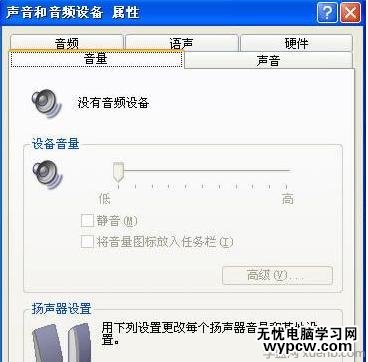 3、或者打開控制面板,找到聲音和音頻設(shè)備,雙擊打開,如果出現(xiàn)如下圖所示的情況,設(shè)備音量這一項都無法調(diào)節(jié),音頻中默認(rèn)設(shè)備顯示沒有播放設(shè)備、沒有錄音設(shè)備,那么就按照上面的步驟來安裝聲卡驅(qū)動吧。