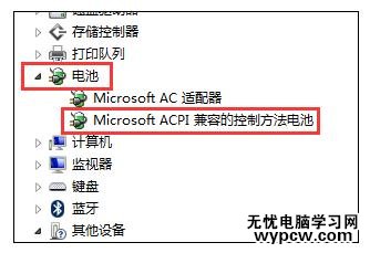 在設備管理器頁面點擊電池選項,卸載Microsoft ACPI Compliant Control Method Battery驅動。