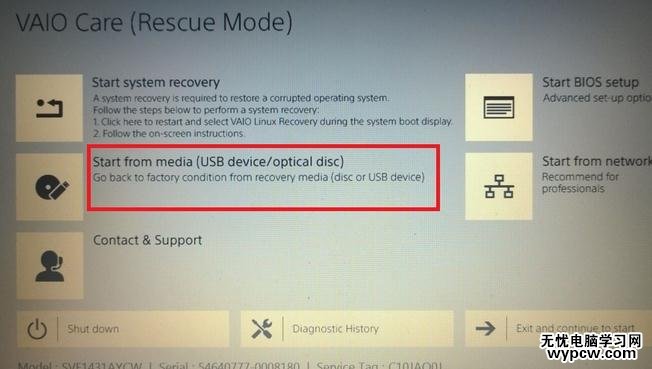 如果想要設置U盤啟動,在vaio care界面上點擊在start from media(usb device /optical disc)就可以自動啟動u盤或光盤啟動電腦。