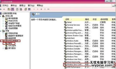 無線網卡正常啟動的話,我們再檢查我們筆記本電腦的無線服務有沒有打開。我的筆記本是xp系統的,鍵選擇“我的電腦”,選擇“管理”,選擇“服務和應用程序”,在服務的頁面內查看“Wireless Zero Configuration"的狀態。如果沒有開啟的話,右鍵選中啟動就可以了。