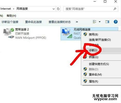 鼠標移到“無線網絡連接”并右擊,選擇“診斷”,由診斷結果恢復連接即可