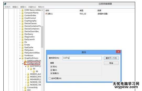 定位到HKEY_LOCAL_MACHINE---SYSTEM---ControlSet001---Control---GraphicsDrivers---Configuration,在Configuration里右鍵點擊查找,輸入scaling,點擊scaling右鍵修改,將數值改為3即可,原值為4.