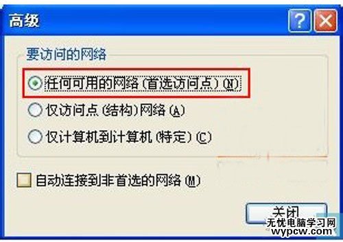 6、在“高級”屬性窗口我們選擇“任何可用的網(wǎng)絡(首先訪問點)”切記不要勾選“自動連接到非首選的網(wǎng)絡”