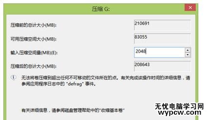 6、選擇菜單中的壓縮卷,進入下圖界面。我們輸出的數(shù)值為新磁盤的容量大小,我們以2G即2048MB為例吧。輸入后點擊確壓縮。點擊壓縮后界面如下圖2所示。