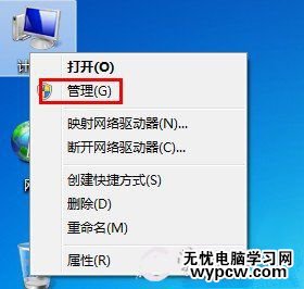 3、一般大家都是用的XP的系統,或者更高版本的,所以小編就以win7系統為例(Win7也是目前最主流系統哦),首先將移動硬盤連接上電腦,然后右擊桌面上的計算機--管理-打開磁盤管理,如下圖: