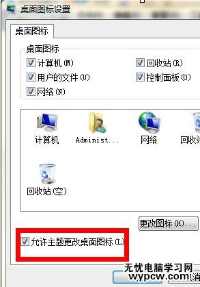 如果有同學電腦不能更改和設置背景圖片,那么就在“個性化”里選擇“更改桌面圖標”,在“允許主題更改桌面圖標”前打鉤就可以了。