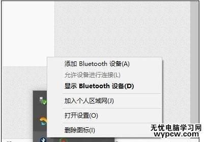 鼠標移到上方,右擊鼠標,出現菜單,添加設備就是我們要添加一個或幾個藍牙設備,比如藍牙鼠標就是一個設備,顯示藍牙設備,就是顯示當前和電腦配對的藍牙設備,加入個人局域網,這個是通過藍牙連接手機上網的,一般用不到,設置是對電腦藍牙進行設置,這里不做詳細介紹!