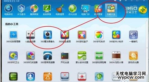 如果你的電腦安有360安全衛士的話,那么就很方便了。打開360安全衛士,進入功能大全界面添加360魔法攝像頭功能即可。