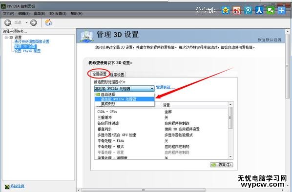 2、管理3D設置 > 全局設置 > 高性能NVIDIA處理器 > 點擊“應用”按鈕保存