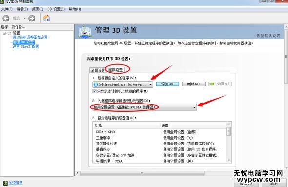 3、(可選步驟)管理3D設置 > 程序設置 > 添加剛啟動谷的猩猩助手進程 HD-Frontend.exe