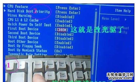 電腦啟動之初點擊Delete鍵便就可以進入BIOS設置,當然這并非絕對,不同的主板進入的方法也不一樣,但是一般都會有提示,跟著提示走即可。然后我們移動到Adcanced BIOS Features并點擊回車,找到Hard Disk Boot Priority并點擊回車,把First Boot Device改為CDROM。
