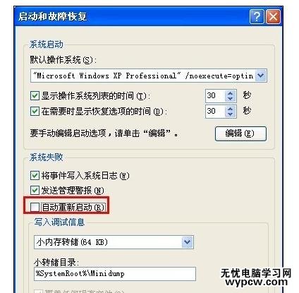 在系統失敗選項下將“自動重新啟動”的復選框去掉,然后一路單擊“確定”按鈕使設置生效。