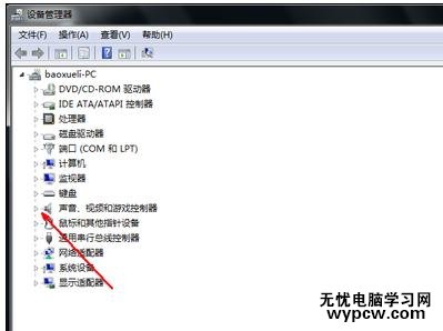 在設(shè)備管理器中,列出了電腦的所有硬件,其中在聲音視頻和游戲控制器選項(xiàng)中,包含了聲卡驅(qū)動(dòng)的信息。用鼠標(biāo)點(diǎn)擊一下前面的小三角。
