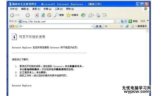 大家都知道,脫機工作就是瀏覽器不使用網絡工作,而是使用曾就瀏覽網頁的時候已經下載下來的文件來工作。如果筆記本電腦瀏覽器開啟了脫機工作,打開陌生的網頁的時候就會看到下面的這個錯誤提示”目前沒有可以的Inte.net 連接。要查看已保存在您計算機上的Internet 內容,請單擊“脫機工作”,遇到此問題只要解除脫機狀態即可解決問題了。下面就由小編跟大家分享具體的操作方法吧,希望對大家有所幫助~