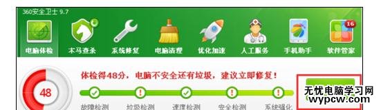 打開殺毒軟件,點(diǎn)擊檢查。你會(huì)發(fā)現(xiàn),電腦狀況很不樂觀。