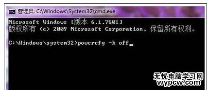 2、在命令提示符框中輸入:powercfg -h off 按下回車鍵 即可關(guān)閉休眠。