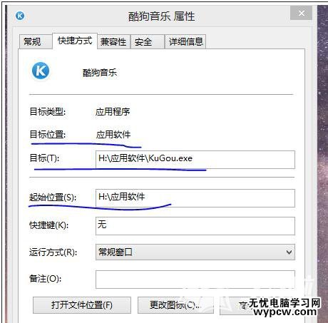 3、桌面圖標的目標位置和起始位置沒有找到酷狗音樂這個文件,可能是程序的安裝文件已經損壞,需要重新安裝軟件。如是在其它文件中找到的,只需更改目標和起始位置的地址即可。