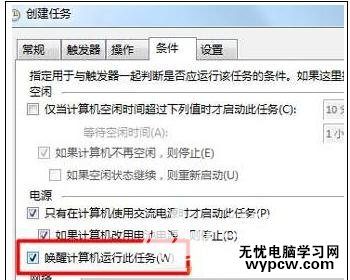 7、切換到“條件”選卡,勾選【喚醒計算機運行此任務】;