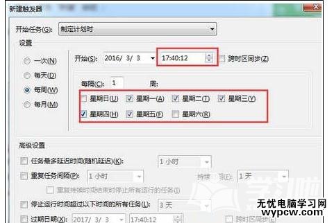 4、點擊“每周”,然后在右側勾選需要提醒的是工作日,比如把“星期一”至“星期五”勾選,再設置需要提醒的時間;