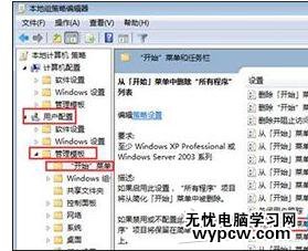 2.在打開的本地組策略編輯器窗口中,咱們依次點擊展開左側菜單中的“用戶配置——管理模塊——開始菜單和任務欄”,然后就可以看到右側的列表中有一個“從開始菜單中刪除所有程序”的選項了。