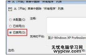 3.咱們雙擊打開“從開始菜單中刪除所有程序”,在彈出來的窗口中,將默認的設置更改為“已禁用”,然后點擊下方的確定保存設置即可。