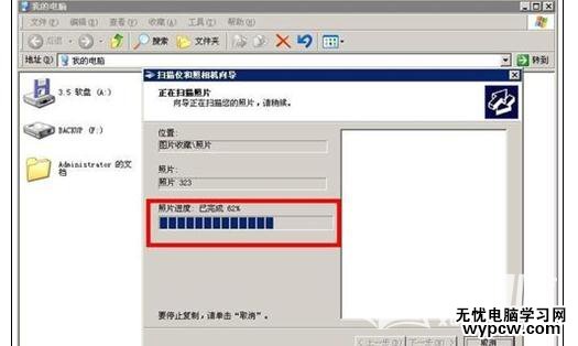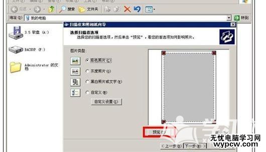 4、這時候掃描儀向導就打開了,這里有一個預覽按鈕,具體位置如下圖所示,我們點擊預覽,就可以在上面的框中預覽到自己要掃描的原件了,然后可以調整選框的位置;