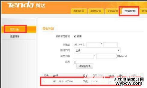 4、接著切換到“寬帶控制”選項卡,勾選“啟用寬帶控制”選項,同時設置IP地址范圍以及要限制的網速,將除自己以外的電腦網速進行限制。如圖所示: