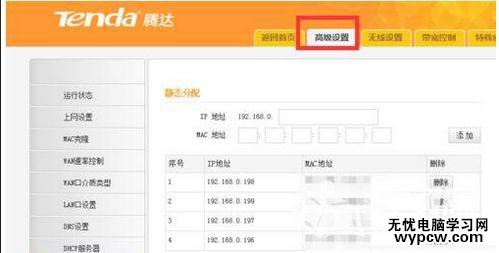 3、接下來我們需要限制或合理分配局域網電腦網速。登陸路由器后臺管理界面,切換到“高級設置”-“DHCP客戶端列表”選項卡,為自己的電腦設備靜態IP地址分配