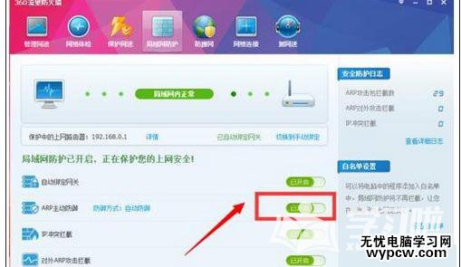 2、從打開的“360流量防火墻”界面中,切換到“局域網防護”選項卡,開啟“ARP主動防御”,以阻止局域網ARP攻擊的發生。從而確保網速的正常暢通。