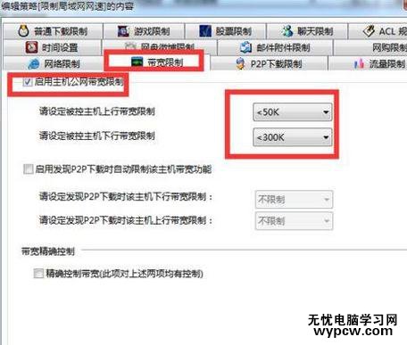 7、從打開的“編輯策略”界面中,切換到“寬帶控制”選項卡,勾選“啟用主機公網寬帶控制”選項,同時設置“上行帶寬”和“下行帶寬”,點擊“確定”完成設置。