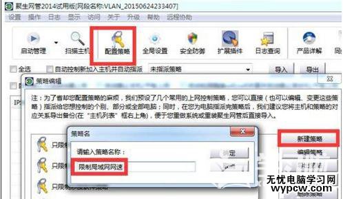 6、安裝并運行“聚生網管”程序,在其主界面中點擊“配置策略”按鈕,從彈出的窗口中創建一個名為“限制局域網網速”的新策略。