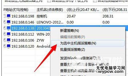 9、從列出的局域網主機中找到占用網速較大的計算機,右擊選擇“為選中主機指派策略”項。并從彈出的“重裝指派策略”窗口中選擇新創建的策略即可。