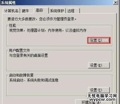 3、隨后切換至高級選項卡,在性能欄中打開設置,如圖所示:
